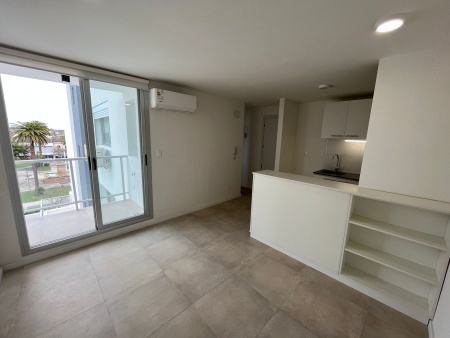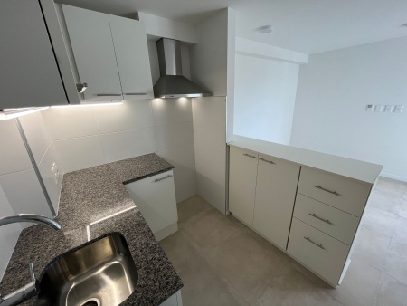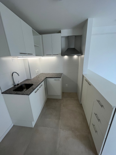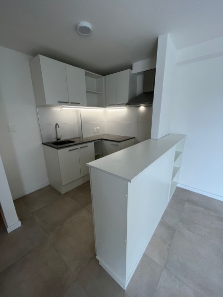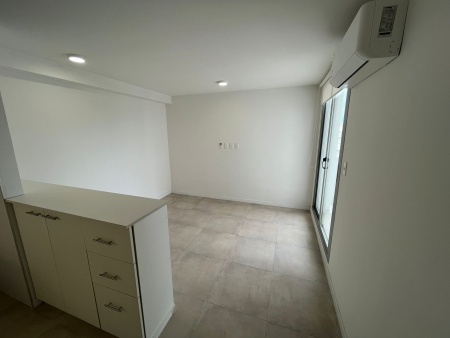 - Living comedor con cocina integrada. El mismo cuenta con aire acondicionado y cortinas rollers; la cocina además tiene barra y mueble bajo mesada empotrado, extractor, calefón y luces led.