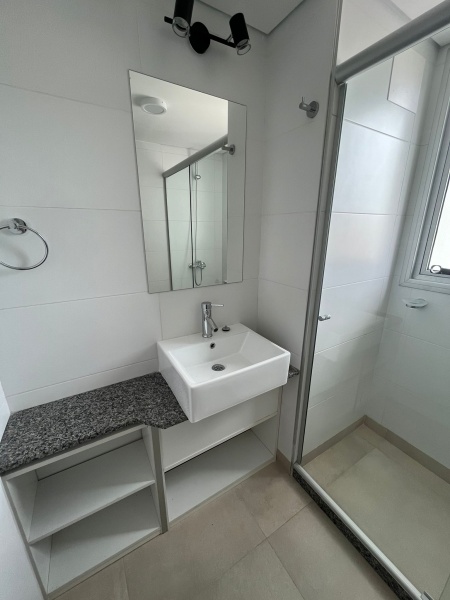 - 1 baño con mueble de guardado, calefón y mampara de vidrio.