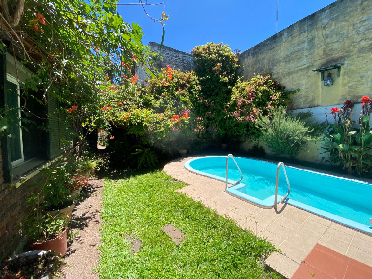Disfrutable patio y jardín con piscina, habitación de invitados con baño y parrillero techado, pieza de depósito.