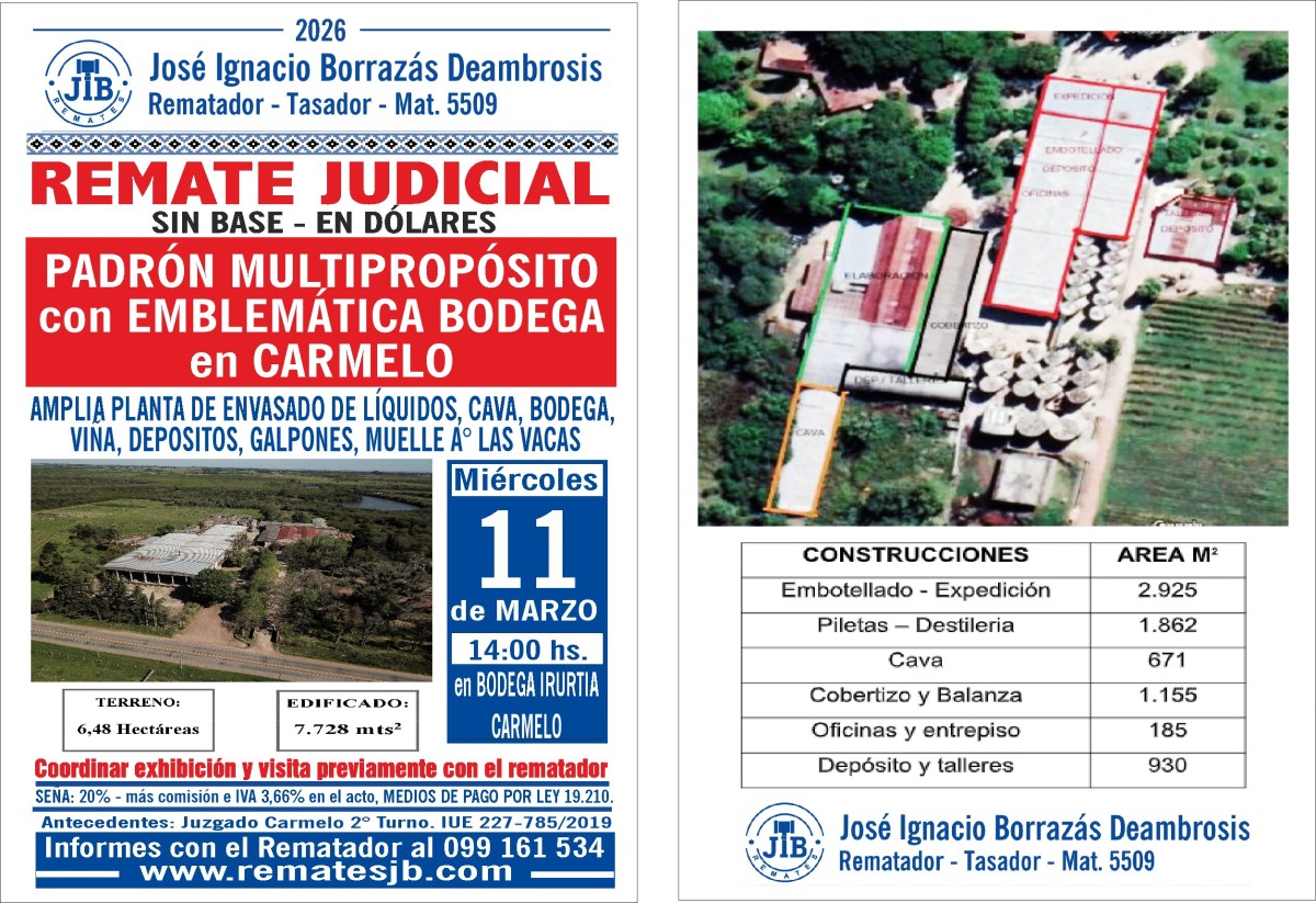 Espectacular predio multipropósito en Carmelo, con importante y moderna planta de envasado de líquidos, oficinas, galpones, depósitos, cava, bodega, viñas, balanza, acceso sobre el Arroyo "Las Vacas", muy cerca de Carmelo.