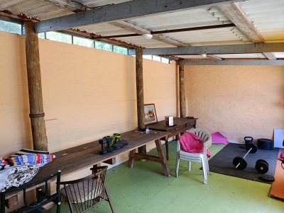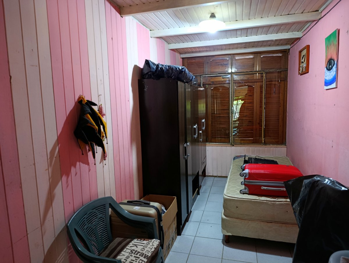 Construcción sólida con techos de plancha y zinc superior, instalaciones eléctricas nuevas, patio al frente con rejas y entrada para un vehículo.