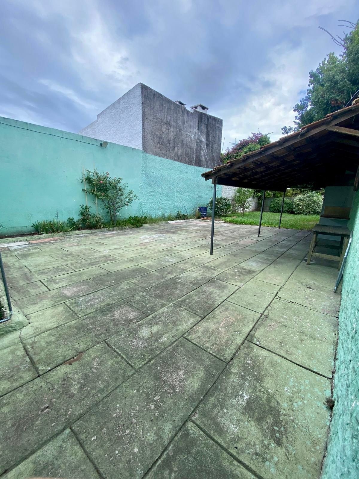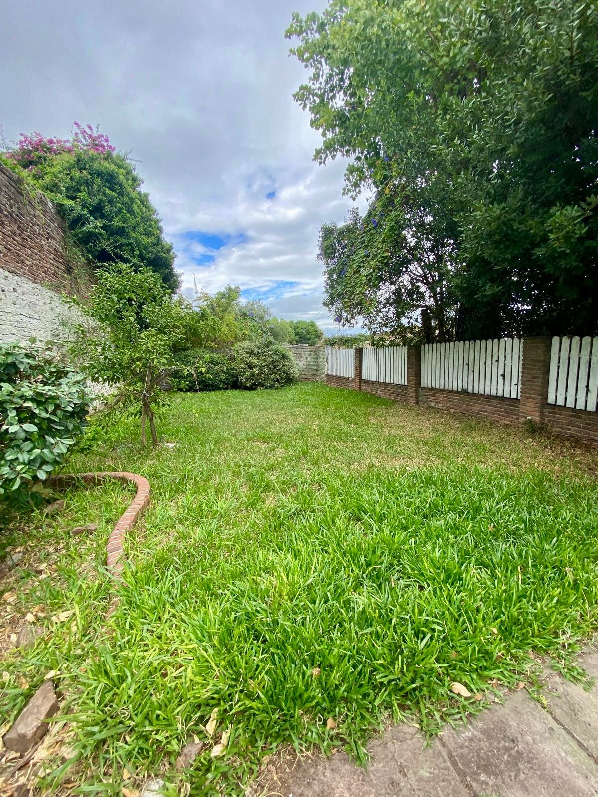 -Amplio patio; una parte de material y otra con césped.