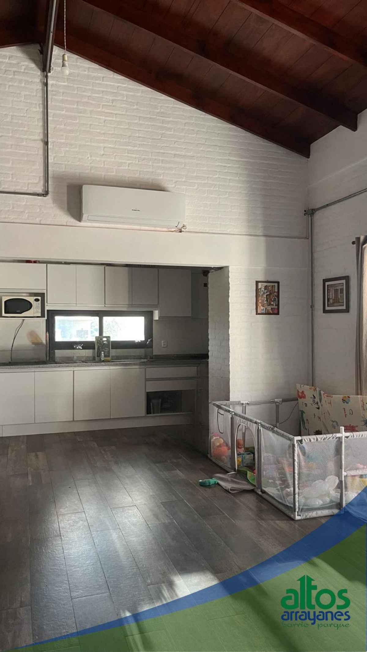 Con un living amplio y acogedor, techos de madera que le dan carácter y una conexión constante con el exterior.